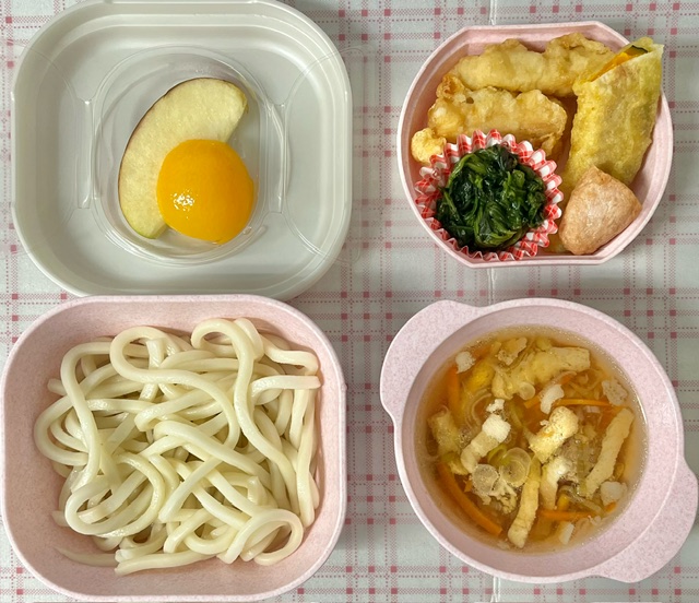 うどん | 小麦粉(北海道産) 長ねぎ(秋田県産) 人参(北海道産) 油揚げ(アメリカ産) 豚肉(アメリカ産、カナダ産) |