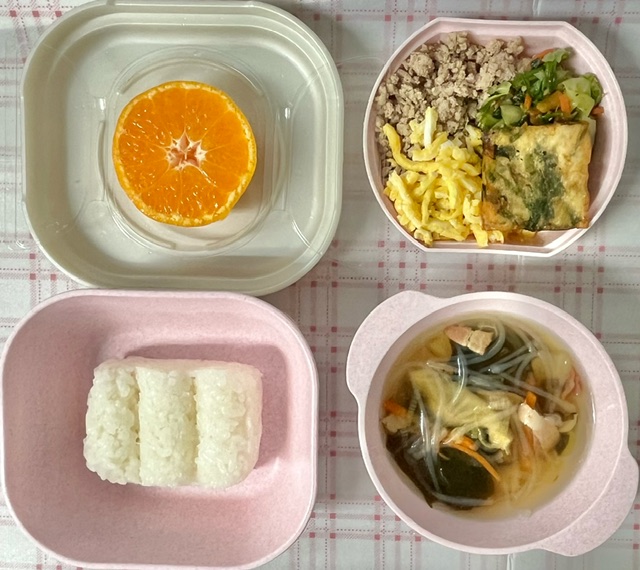 | 春雨スープ | ベーコン(スペイン産) 長ねぎ(秋田県産) 人参(北海道産) 春雨(三重県産) わかめ(韓国産) |
